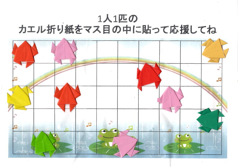 午後8時過ぎに回収に伺うと、カエルの折り紙が10匹貼られていました。これにより、10人がスターレインボーのパネルに立ち止まってくれたことがわかりました。少しずつではありますが、私たちの活動が広まっていることを実感しました。